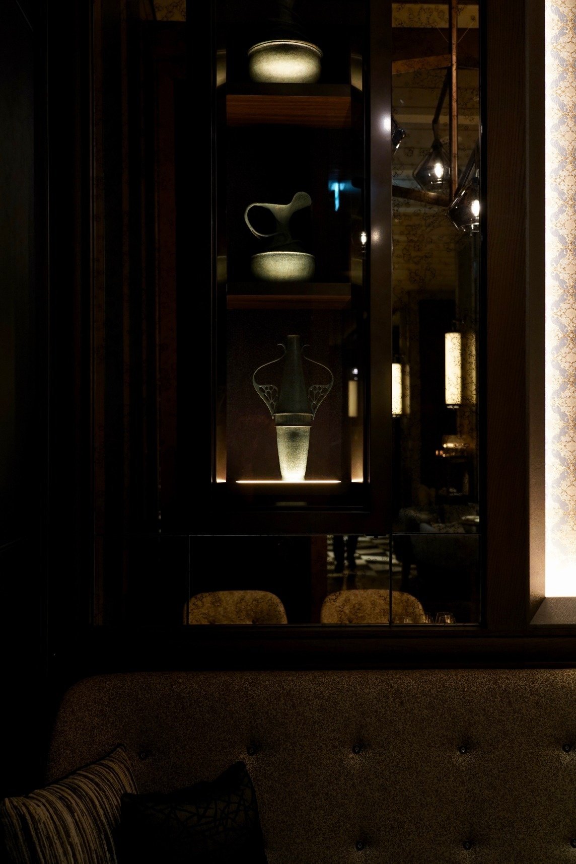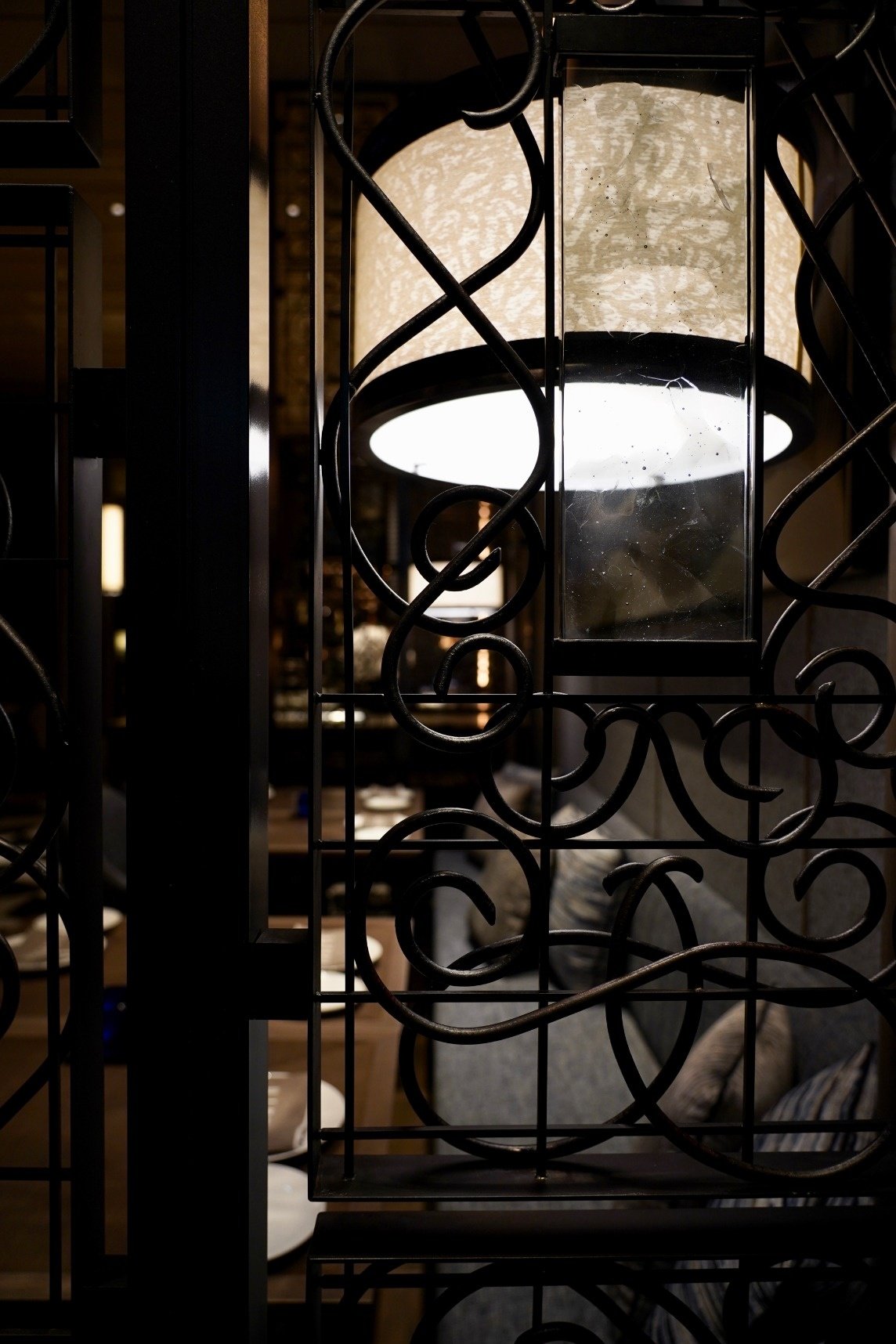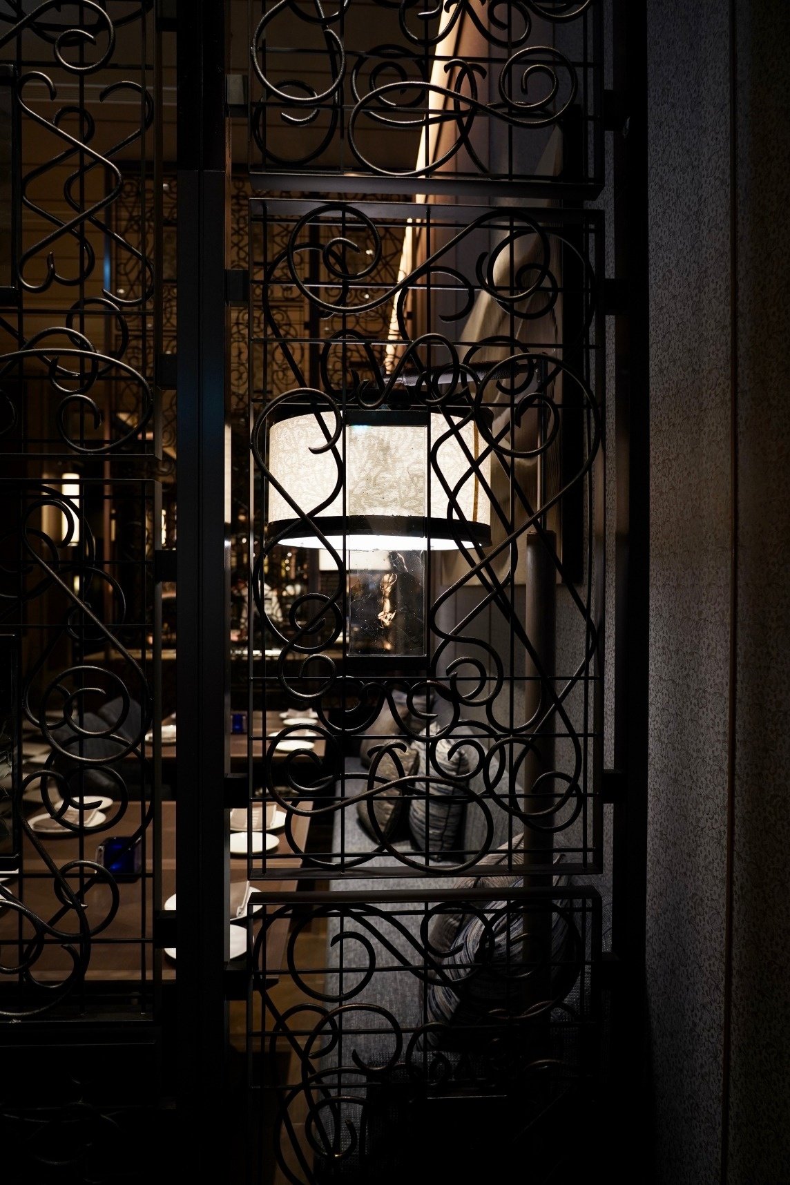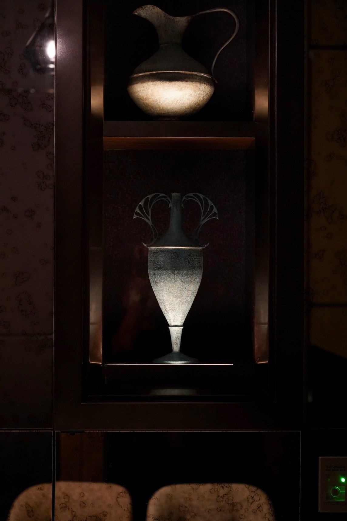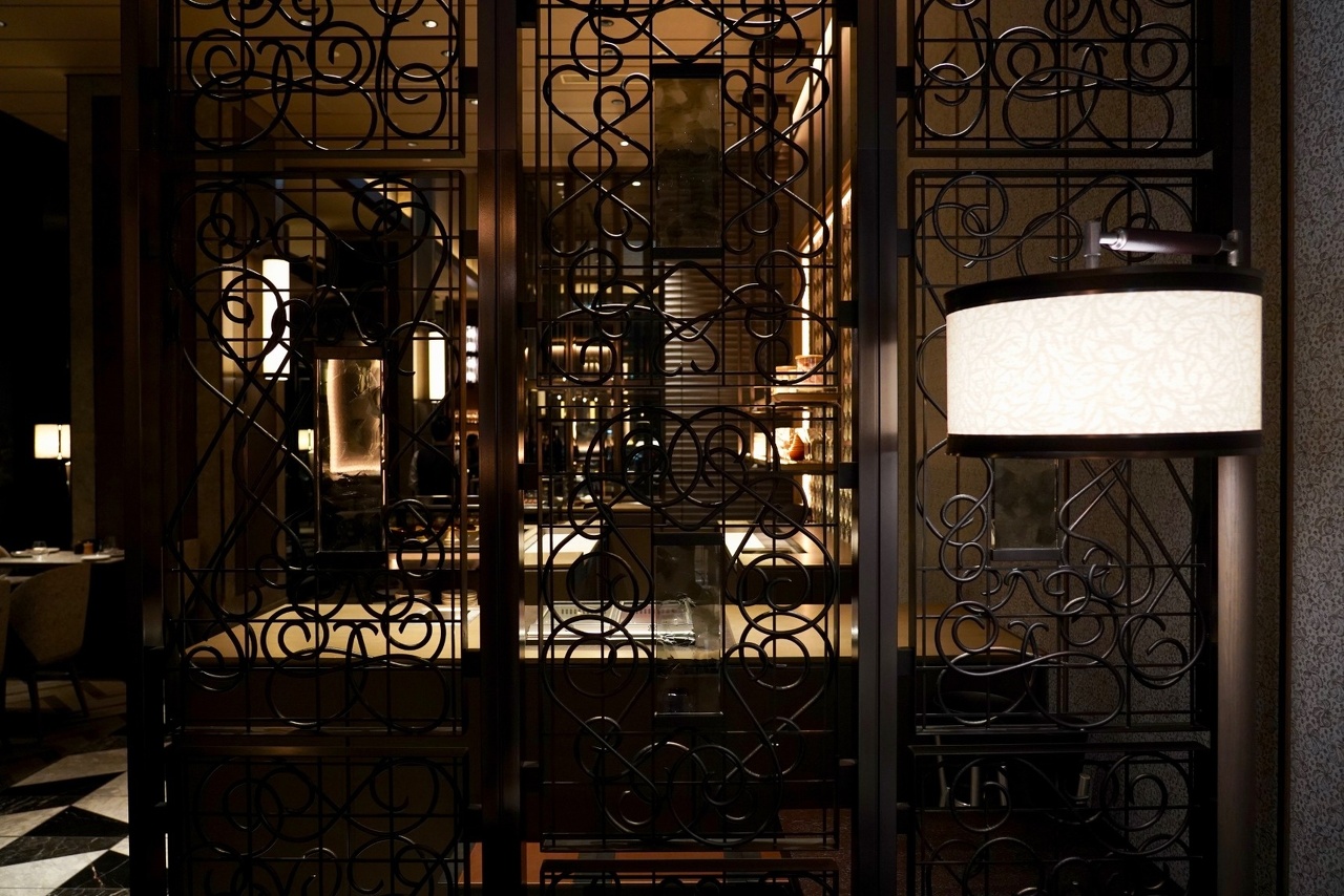 FOUR SEASONS HOTEL TOKYO AT OTEMACHI PIGNETO 上前功夫によるガラスプレートが嵌め込まれた河野迪夫による鍛造アートスクリーン、河野迪夫による‘飛び交う水鳥の翼’をイメージした鍛金オブジェ、‘アンフォラ’(古代ヨーロッパで使われていた壺)をモチーフに鍛金技法で作られた壺