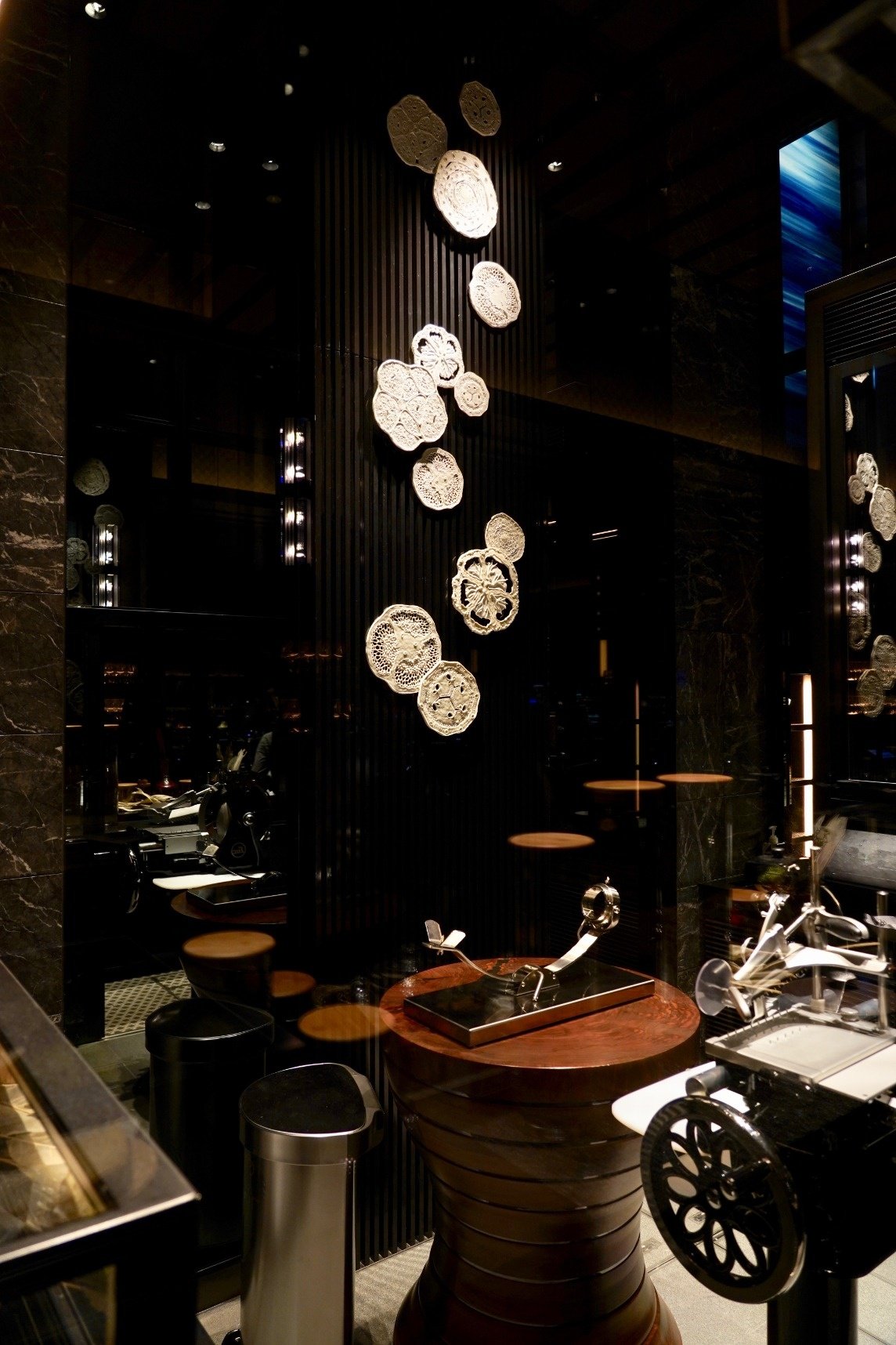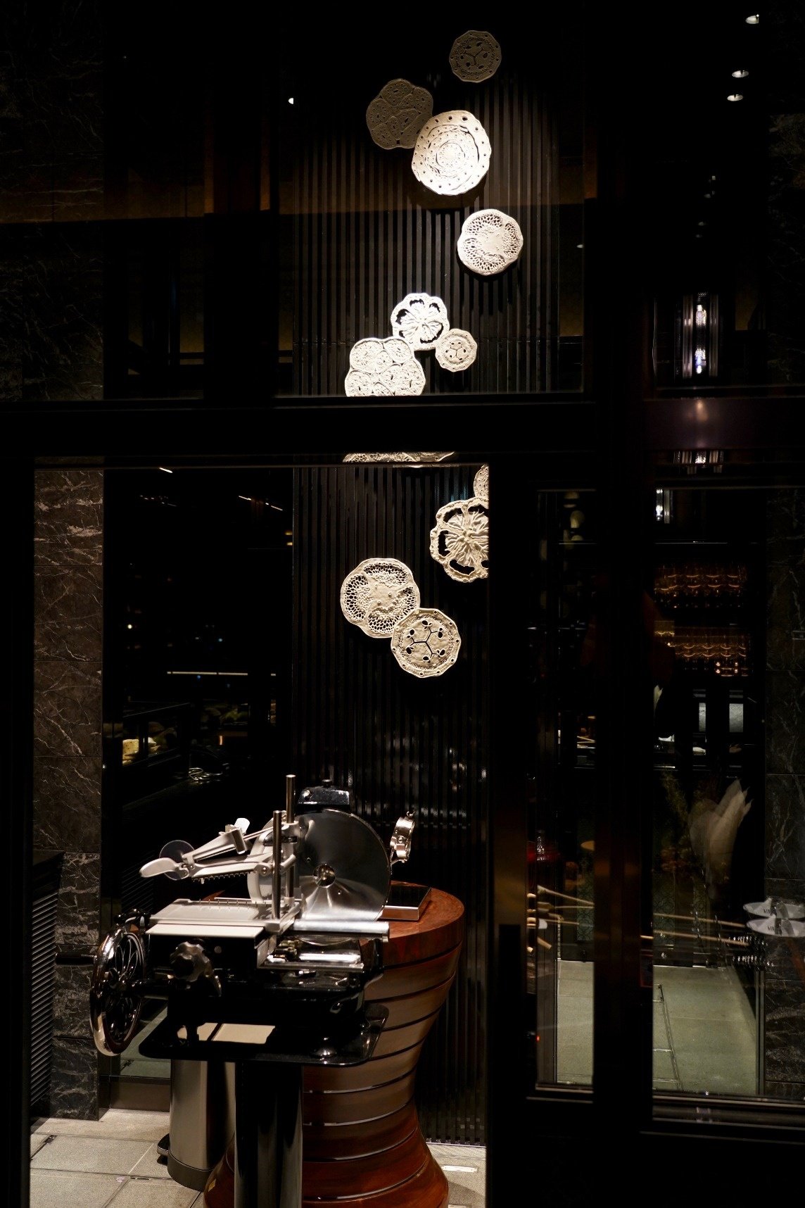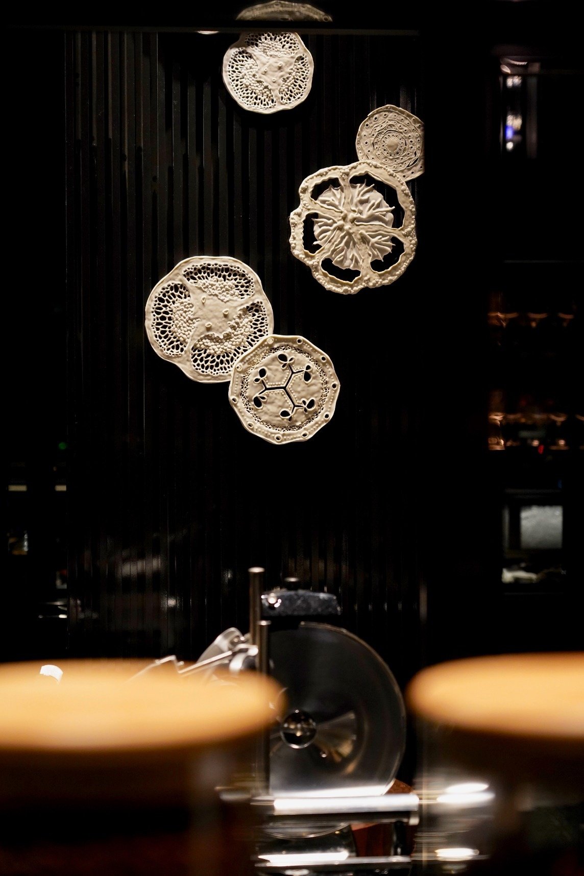 FOUR SEASONS HOTEL TOKYO AT OTEMACHI PIGNETO フォーシーズンズホテル東京大手町イタリアンダイニング ピニェート サルメリア、グリルキッチン部分 佐合道子によるイタリアン野菜モチーフの陶器オブジェ、北本真隆による抽象オイルペインティング(W1165×H3650)