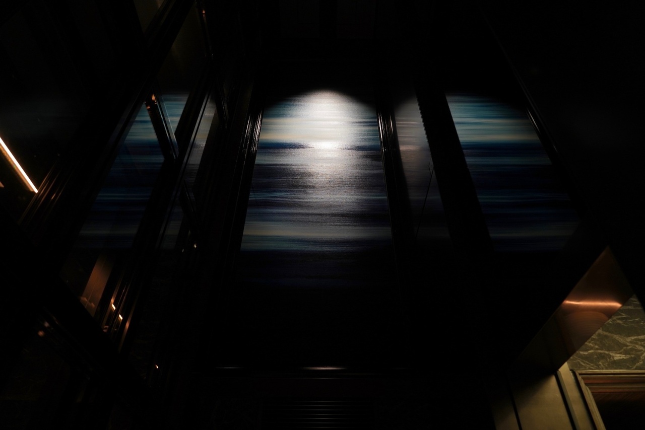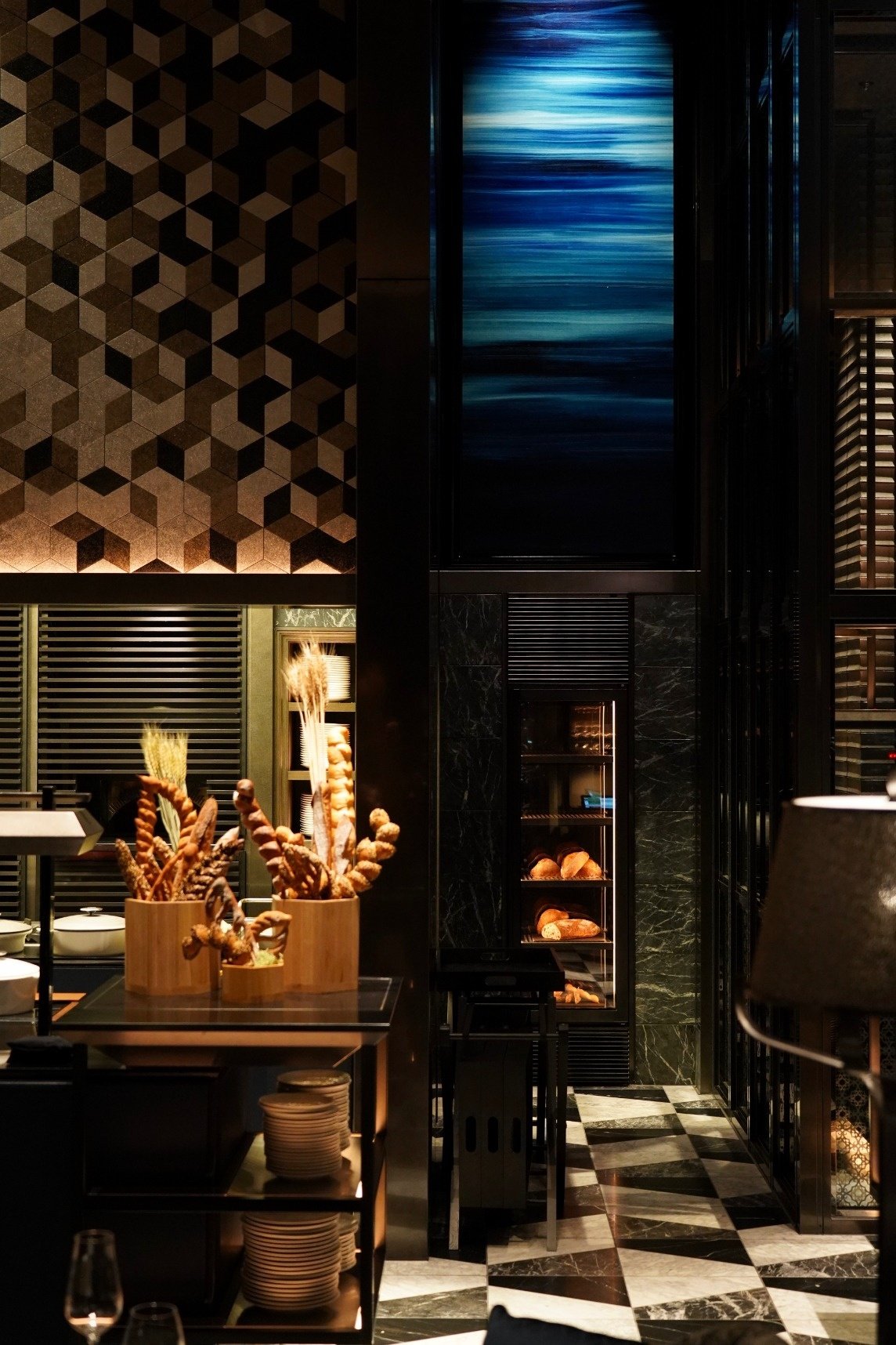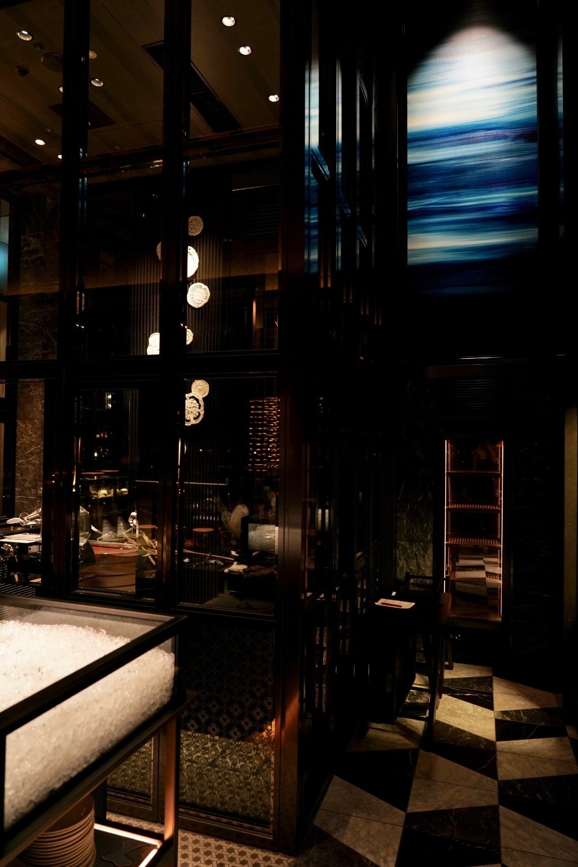 FOUR SEASONS HOTEL TOKYO AT OTEMACHI PIGNETO フォーシーズンズホテル東京大手町イタリアンダイニング ピニェート サルメリア、グリルキッチン部分 佐合道子によるイタリアン野菜モチーフの陶器オブジェ、北本真隆による抽象オイルペインティング(W1165×H3650)