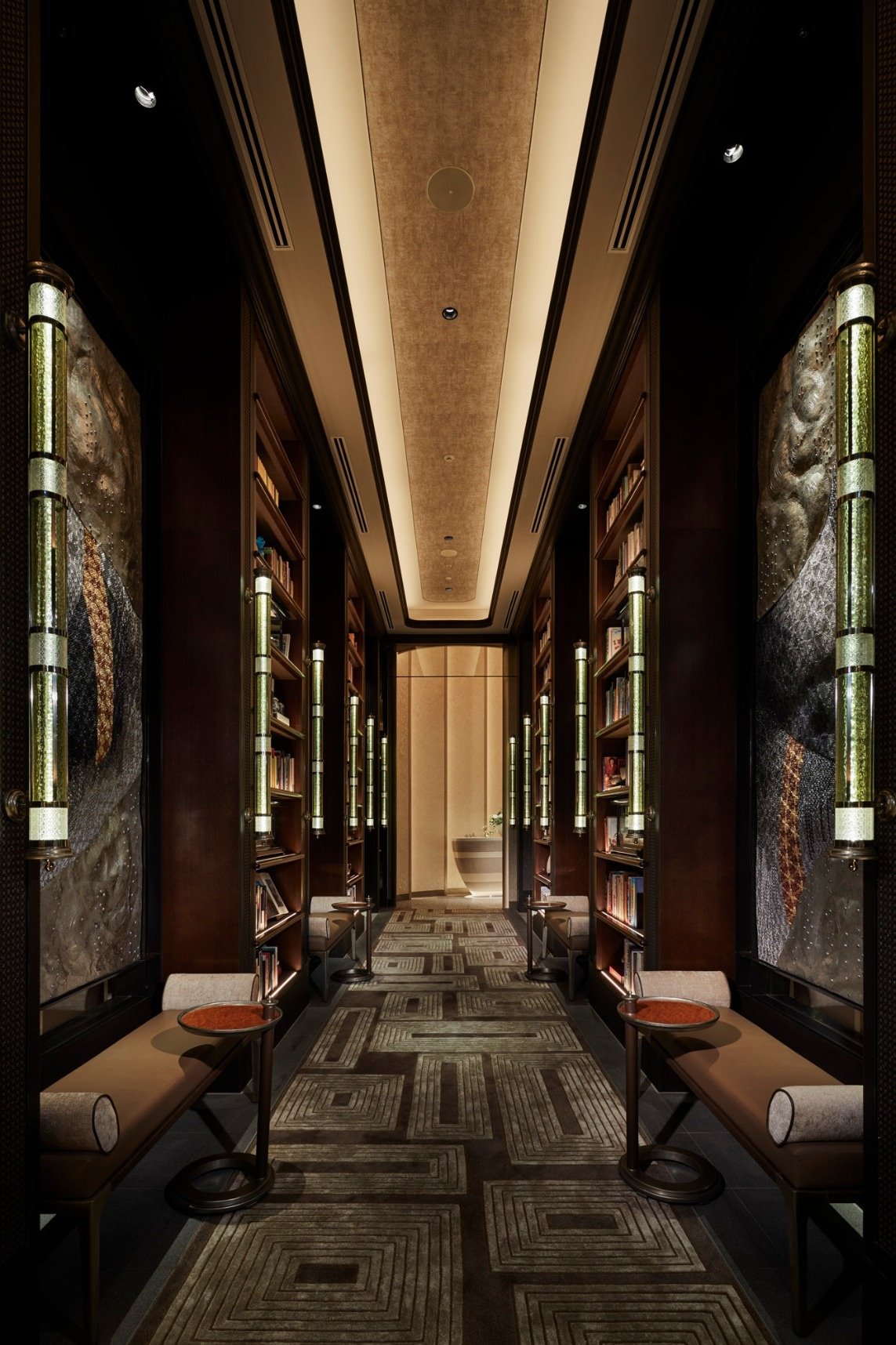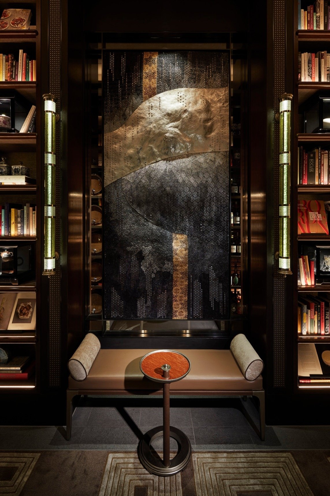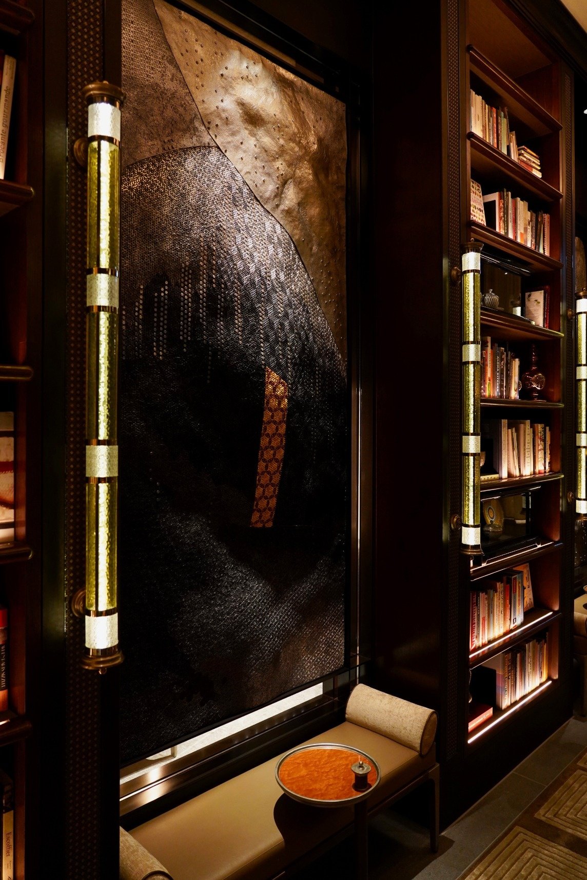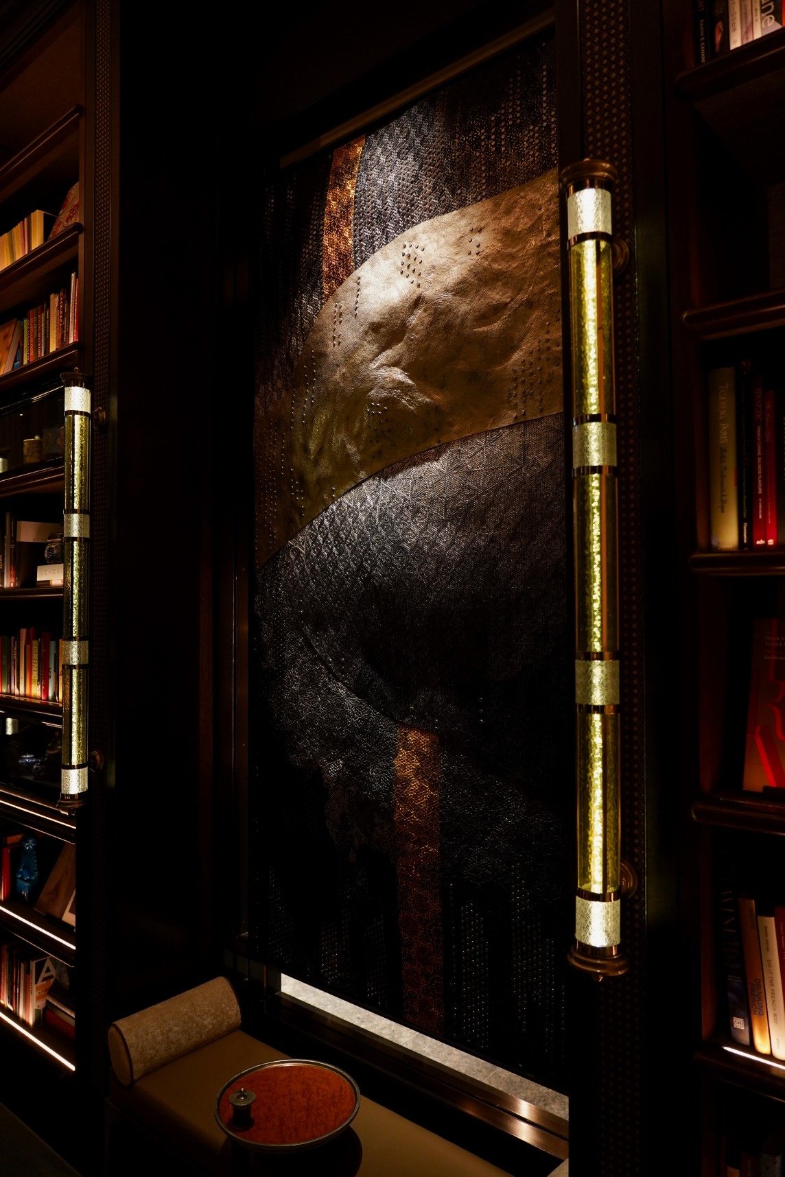 FOUR SEASONS HOTEL TOKYO AT OTEMACHI Library 藪内公美による圧倒的な存在感を放つ‘鍛金と部分的な刺繍(パンチングメタル部分)’によって描かれた現代の水墨画(それぞれW1100×H2300)をライブラリー回廊に4枚